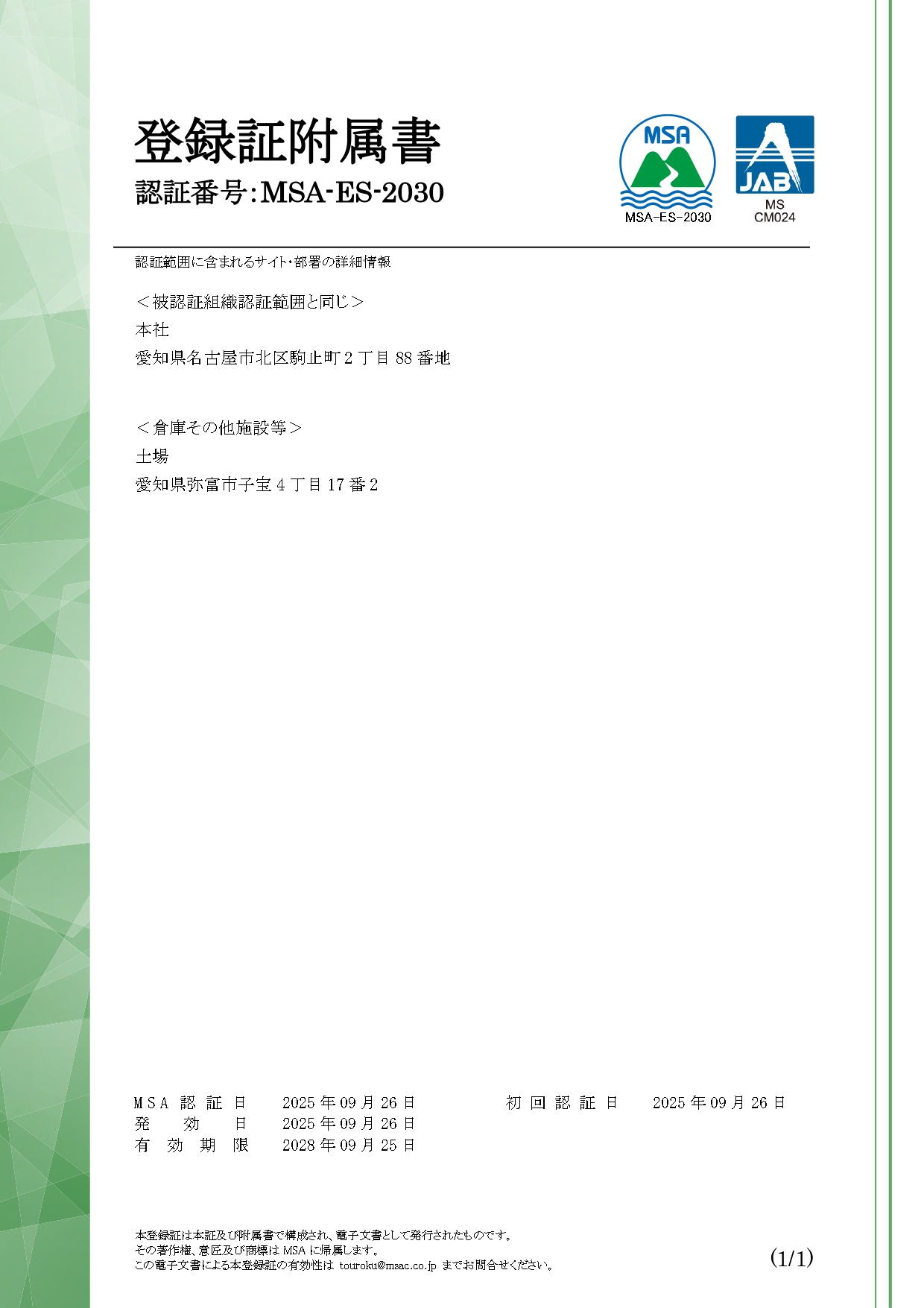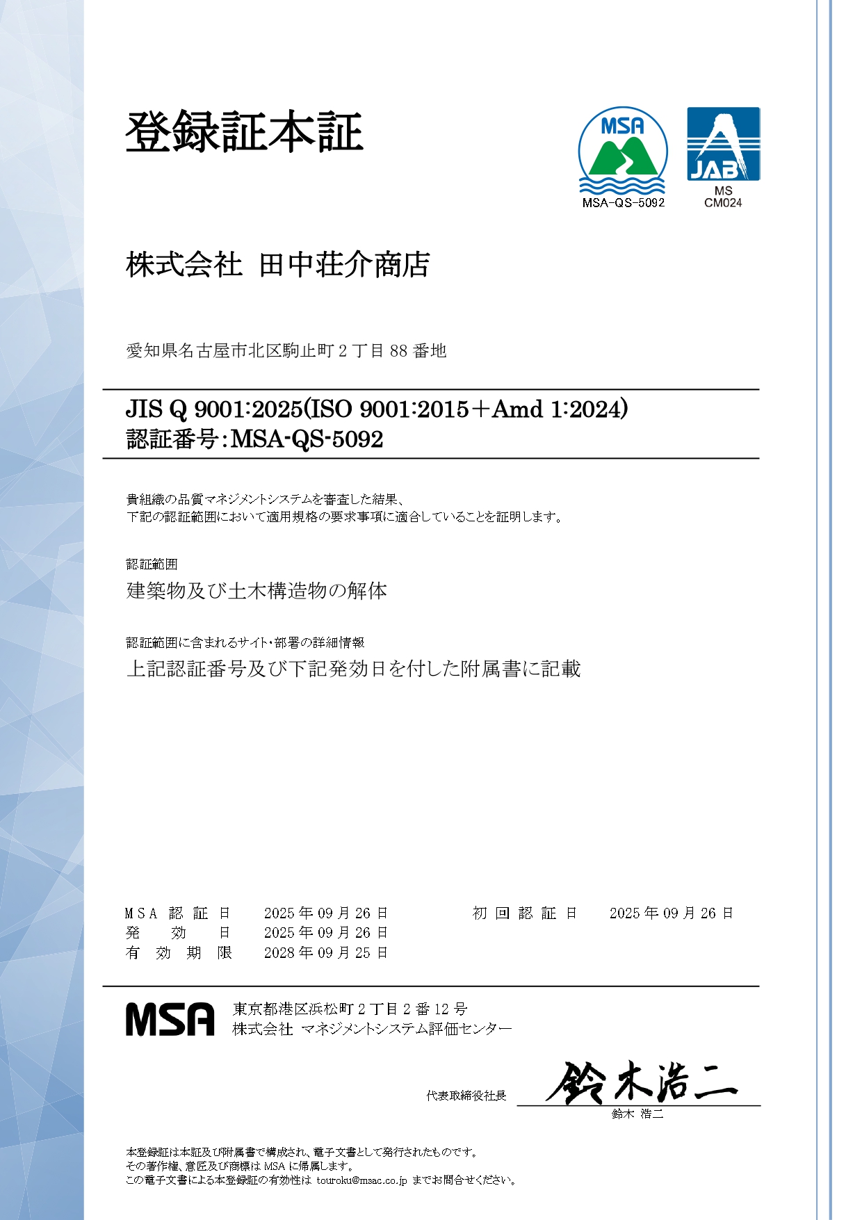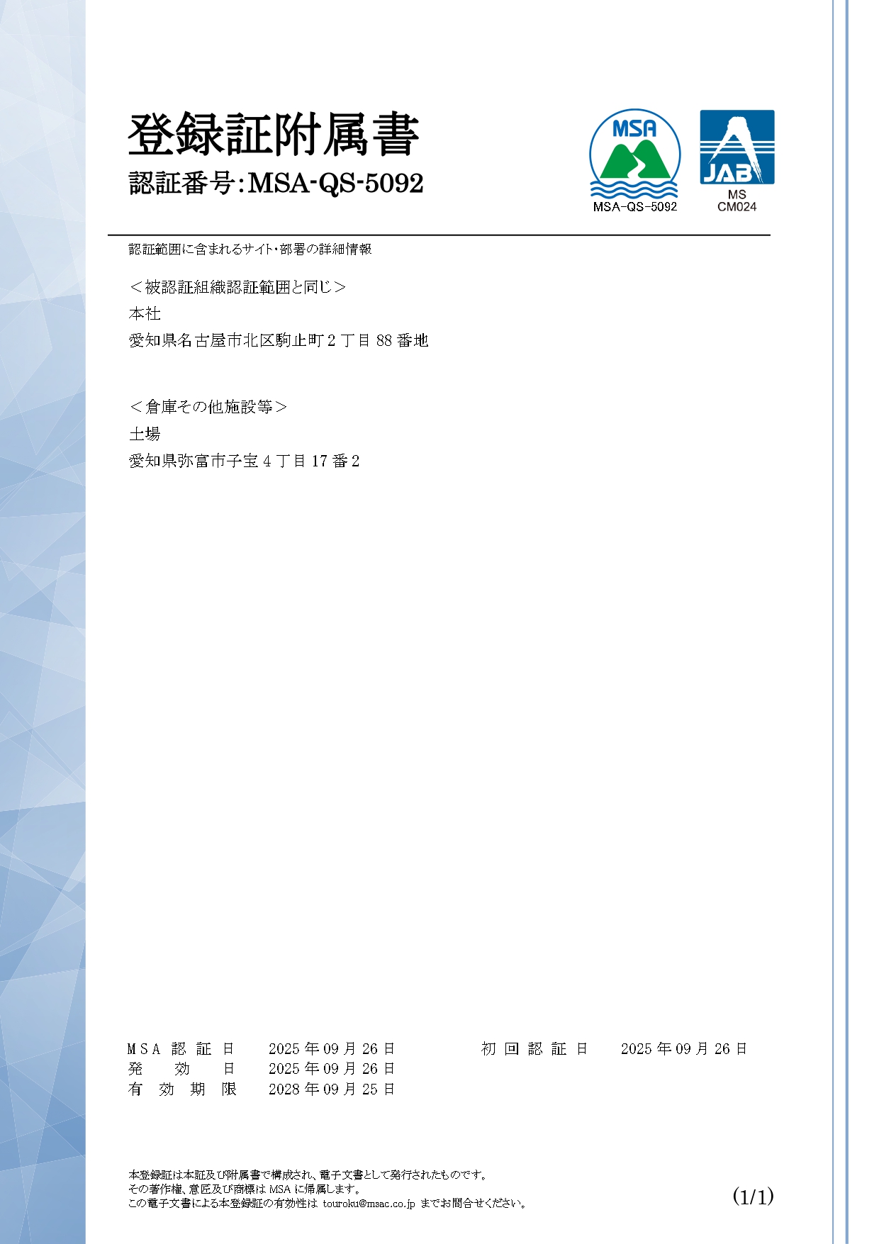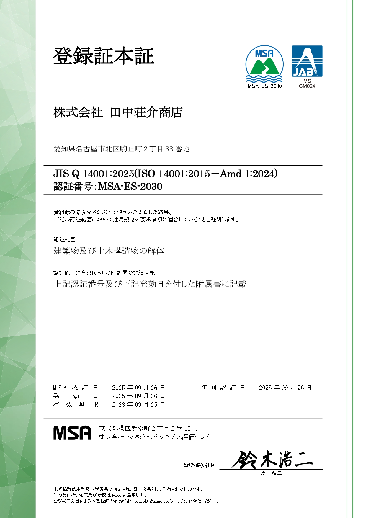 令和7年9月26日付で品質マネジメントシステム JIS Q 9001:2025(ISO 9001:2015+Amd 1:2024)及び環境マネジメントシステム JIS Q 14001:2025(ISO14001:2015+Amd 1:204)を取得いたしました。